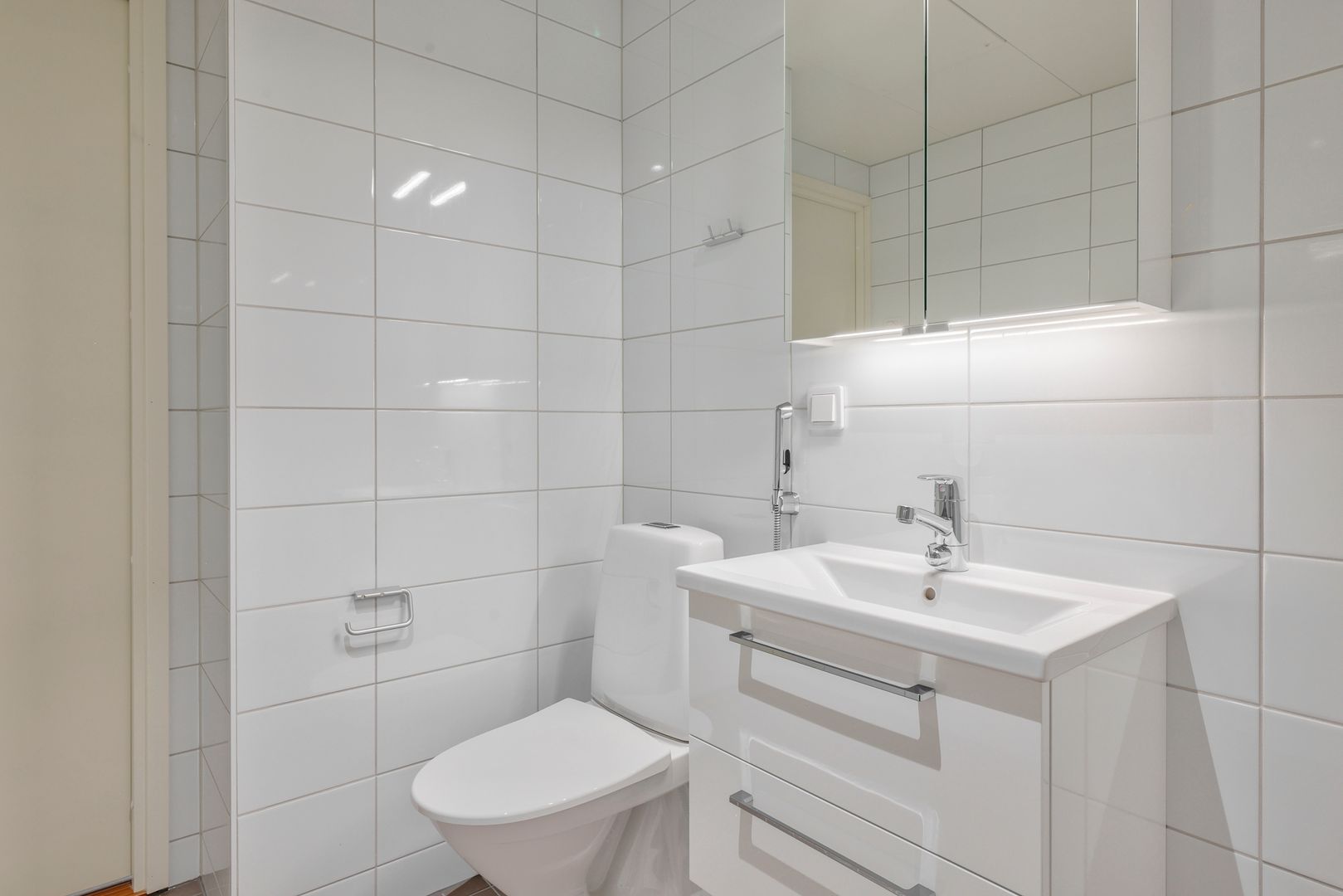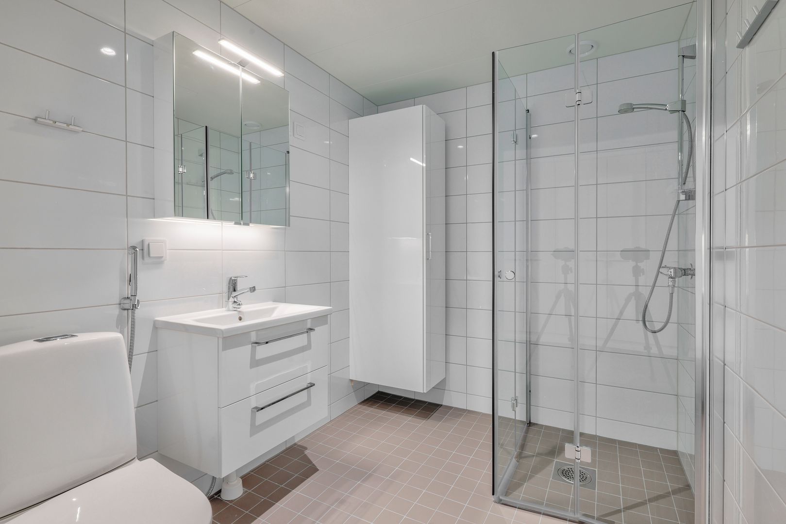 WC-istuin, suihku, pesukoneliitäntä, lattialämmitys, peilikaappi, pesuallas, allaskaappi, bidee-suihku ja pyykkikaappi